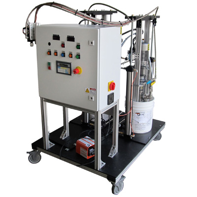 The DCT-2000R Multi-Component Dispensing System is a flexible, digitally controlled cart-mounted meter mix system. This system features proprietary positive displacement pump technology to provide accurate dispensing from pails and drums. Progressive cavity pump technology provides the most efficient dispense possible, with continuous flow, no pulsation and low shear. It includes proprietary microprocessor controls with a touch pad user interface.